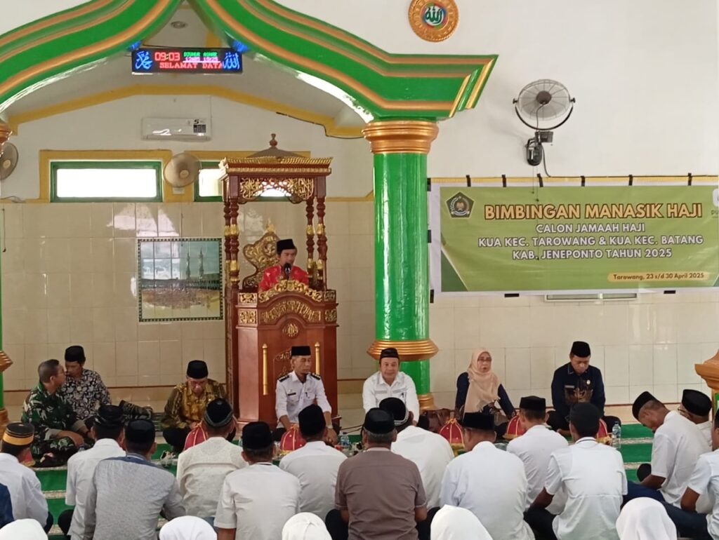 JENEPONTO, Aliefmedia.com – Kementerian Agama Kabupaten Jeneponto melalui Kantor Urusan Agama Kecamatan Tarowang dan KUA Kecamatan Batang sebagai Panitia pelaksana Bimbingan Manasik Haji Calon Jamaah Haji KUA Kecamatan Tarowang dan KUA Kecamatan Batang Kabupaten Jeneponto tahun 2025 yang dilaksanakan di Masjid Nurul Amin Kecamatan Tarowang, Rabu 23/04/2025.