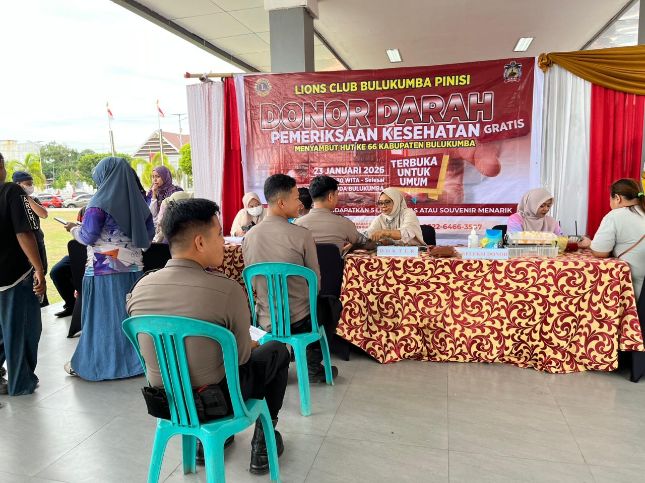 BULUKUMBA, Aliefmedia.com — Sebanyak 22 personel Polres Bulukumba ikut donor darah pada kegiatan sosial donor darah yang digelar oleh Lions Club Bulukumba Pinisi dalam rangka menyambut Hari Ulang Tahun (HUT) ke-66 Kabupaten Bulukumba, yang berlangsung di tribun Lapangan Pemuda, Kota Bulukumba, Jumat (23/1/2026).