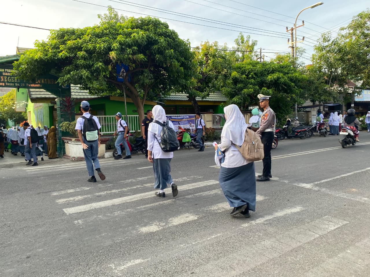 Personel Satlantas dan Satsamapta disiagakan di titik-titik rawan kemacetan dan kecelakaan lalu lintas untuk membantu penyeberangan pelajar, mengurai kepadatan kendaraan, serta memastikan arus lalu lintas tetap aman, tertib, dan lancar.